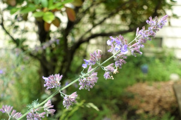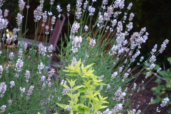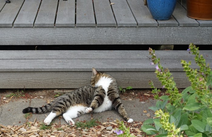 After these visitations I come home hungry and ready for breakfast. By now Sue is up and dispenses fresh canned morsels to go with the dry kibble that is always there. We visit and talk for awhile. I bat some toys around. I visit grandma if she is up. I get all the petting and scratching and love I need and then I am ready to go outside again to play or just to stop and smell the roses. Well, the lavender, actually. And the catmint. That aroma drives me crazy (in a good way) and is practically sacred to our species.