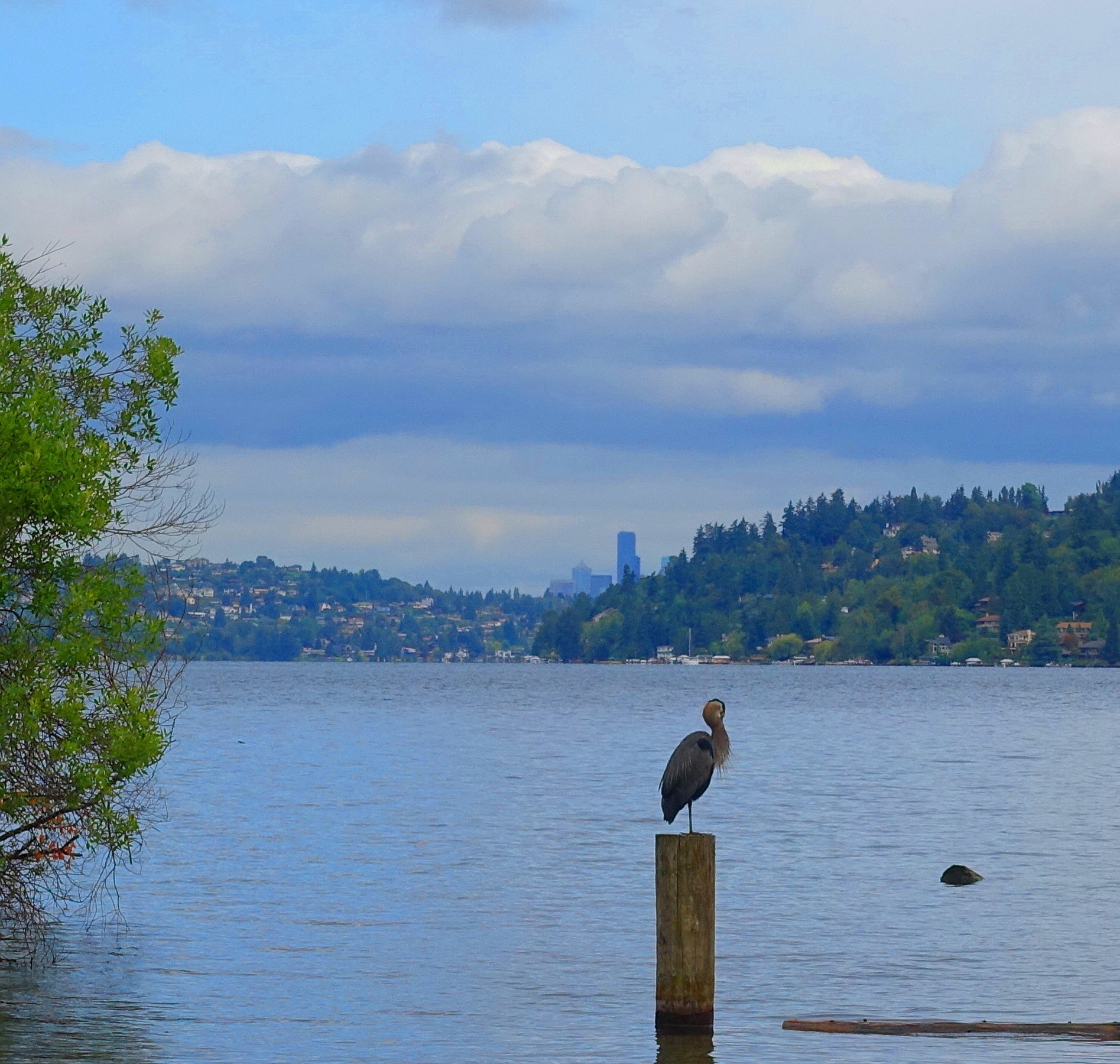and a blue heron standing tall against the skyscrapers of Seattle..