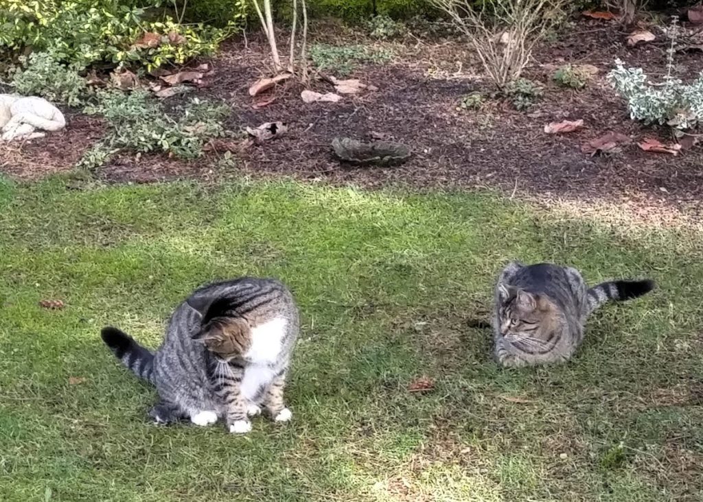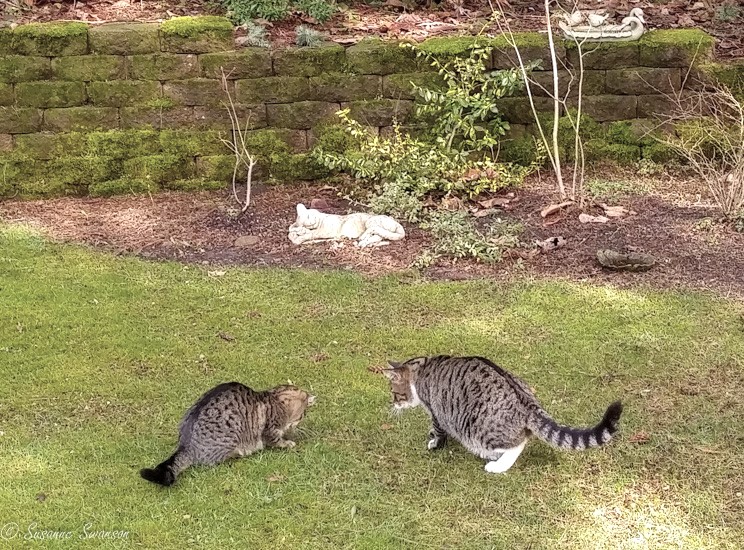 It was a beautiful day with mild temperatures and no rain. Tiger and I were out sporting around, all in good fun. Sue happened upon us just as I found the catch of the day. Bad timing to say the least. And wouldn’t you know it she accidentally let him escape by picking me up to cuddle at the most inopportune moment. Oh well. I’m always up for a cuddle. And I knew I could catch him later. He was not that bright and he was awfully slow. (Just begging to be caught in fact. No challenge at all. But I digress.)