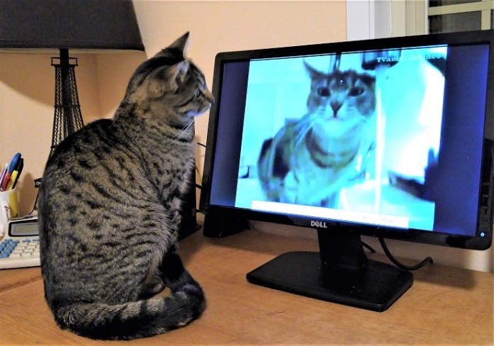 Effie is a huge fan of animal videos, especially cats and birds. It’s Vic’s way of keeping her peaceful in the morning, when he’s trying to get chores done, ready for work, etc., and I’m focused on getting ready for breakfast so we can eat together before he needs to leave. . .She gets yowly, wanting to go out, come in, repeat. . .but the videos help her stay tractable when we can’t be her on-the-spot door personnel.