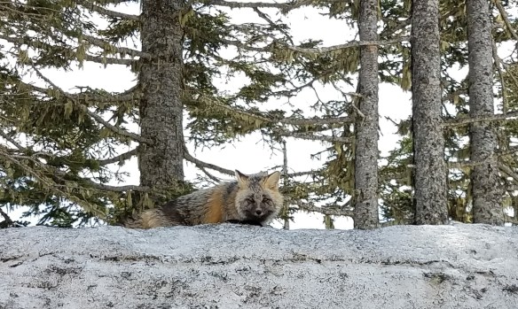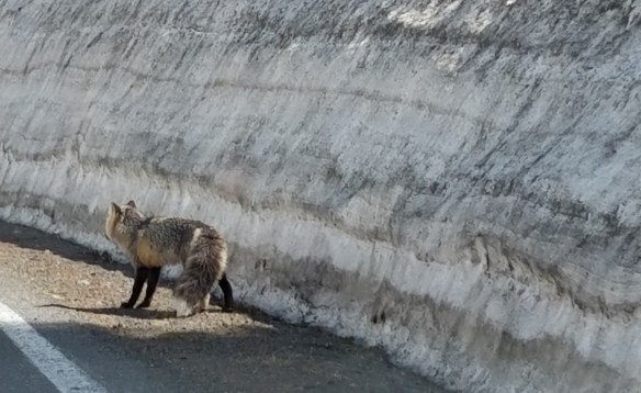 Near the top we spot a red fox by the side of the road who wisely climbs the snow bank to safer ground.