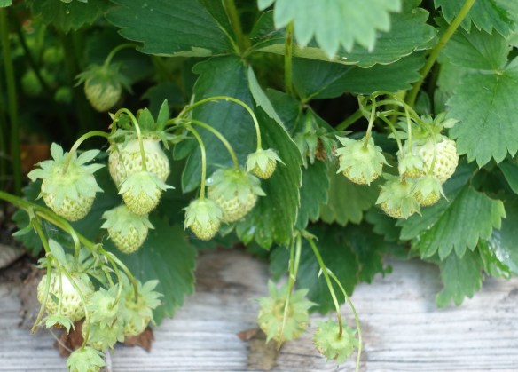 After our walk, I visit the garden. It’s early but the herbs are already cheerful and bright and loads of strawberries have set on and should ripen soon.