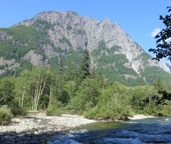 I walk the trail nearby, enjoying the beauty of the river and mountains and every green thing. Happy.