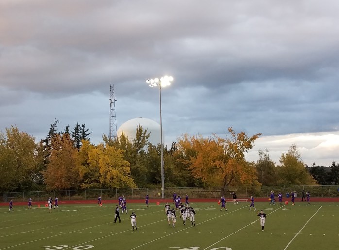 Okay so I’m not that much of a football fan. And I began to notice the lovely fall colors and how the purple uniforms (our team) blended into the scene; and the red track circling the field made a nice accent.