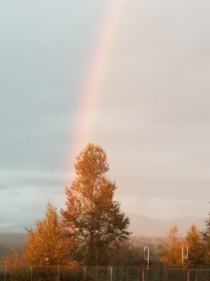 Periodically the heavens opened and our big umbrella was our refuge. Exposed parts of the blanket became soggy. Then as the sun was setting, this rainbow appeared over the field.