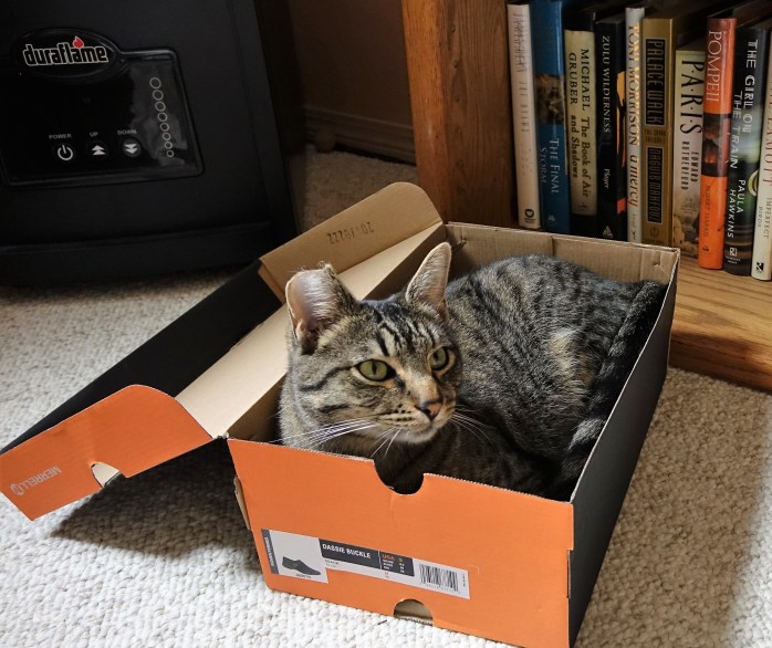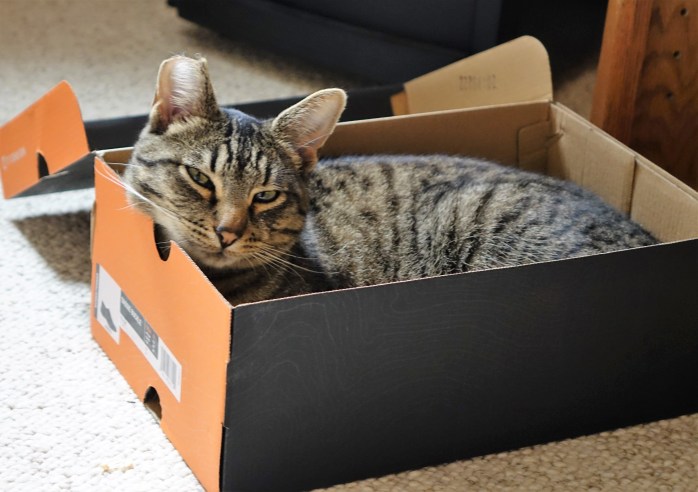 “Hi Benji. I see you found the box from my new shoes. What is it about cats and boxes? What compels you to get into an empty box?”