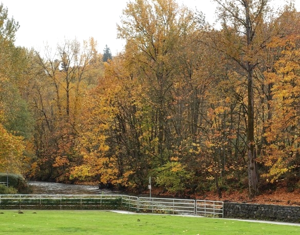 What a difference a day makes! This morning brought brief snow flurries to the region (the earliest I can remember) but yesterday was mild with only light rain. I’m happy we took our walk on the Cedar River Trail yesterday. The Trail follows the river 17 miles beginning from the Cedar River watershed in the south, through Maple Valley and Renton in the north, to where the river flows into Lake Washington. We often walk the northern portion of the trail where it passes by the Renton Boeing Plant but found yesterday’s walk further south even better.