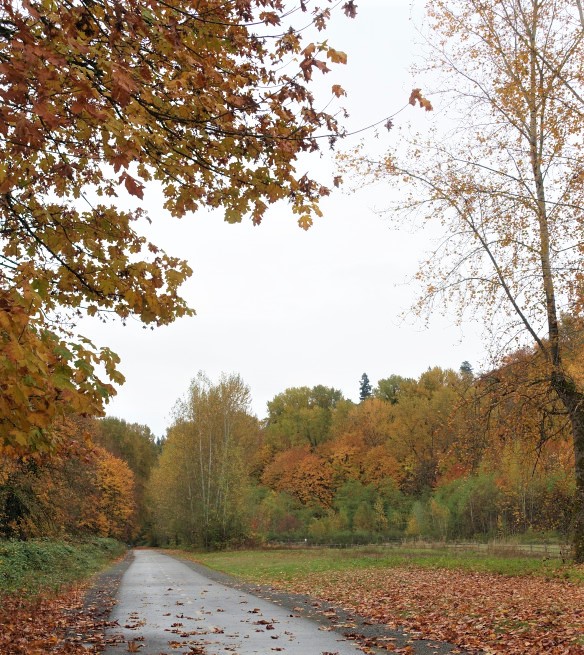 We accessed the trail at the Cedar River Park on the Maple Valley Highway and found it quieter and less traveled as it weaved through park and forest. Fall colors were brilliant and leaves still abundant on the trees and the ground. The fragrance brought up childhood memories of when we’d pile up the fallen leaves and jump into them with abandon.