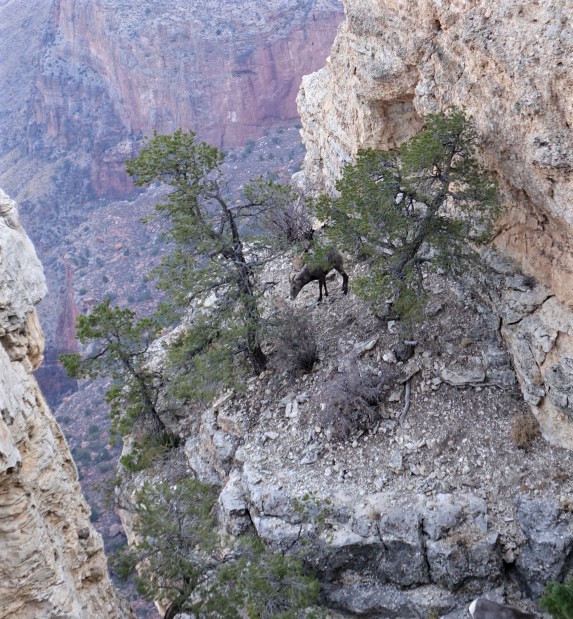 We were fortunate to see a group of Desert Bighorn Sheep hanging out on the cliffs below the rim, nimble-footed, and not afraid of the edge like we were.