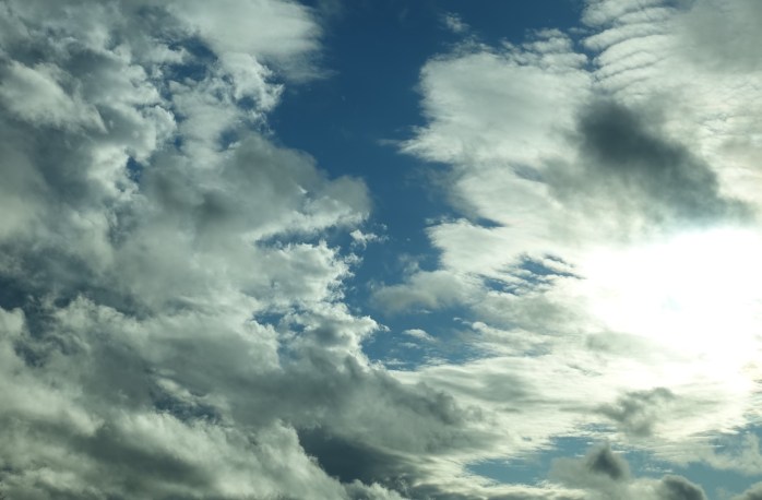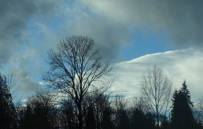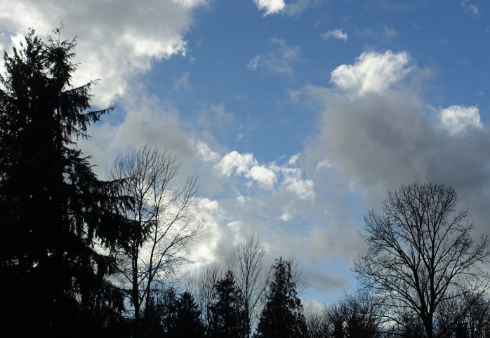 Some days the weather outside matches the weather inside. Today was cold and dark, with steady rain and gusty winds. I didn’t feel like it but went out regardless to run some errands. As I left the last store I noticed the rain had stopped though the wind was chasing the clouds fiercely across the sky. They raced in glorious shades of white, some like snow, some like wool or pale yellow and gray. And finally some brilliant, infused with sun, all against increasing blue patches of sky.