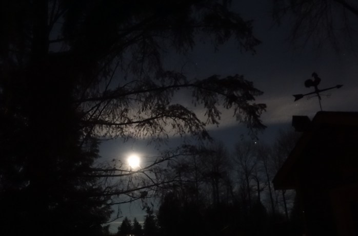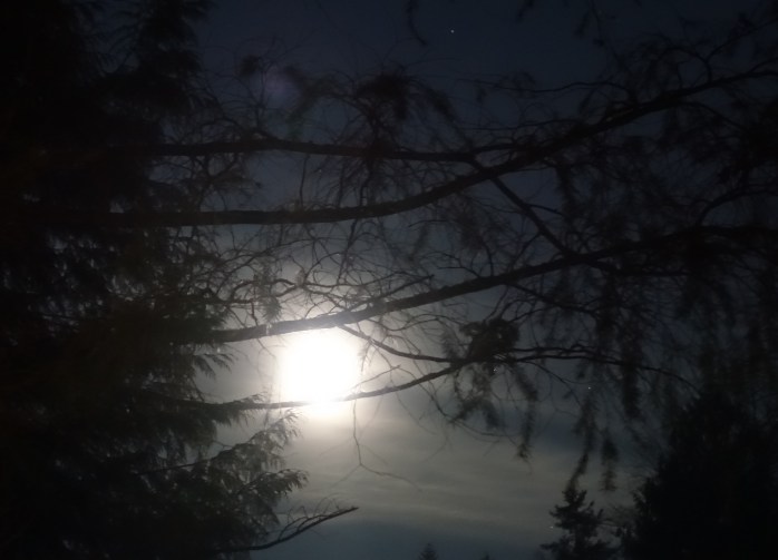 It’s interesting. The first one has an atmosphere that the fourth one, though clearer, lacks. Something to do with the trees – the near tree creating mystery (spookiness, even) and the far ones creating distance. The framing is satifsying, too, with the moon to one side. The third one also has atmosphere – the tree again. However, it loses something, I think, by the moon being placed so exactly in the centre.