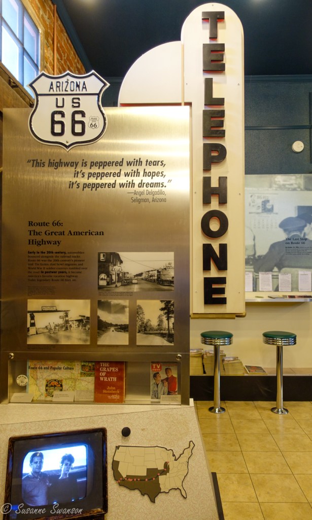 We stopped at the local Visitor Center, where we learned about all things Route 66, especially that part which runs through Arizona. Route 66 was called the ‘Mother Road’ in John Steinbeck’s classic book ‘The Grapes of Wrath.’ During the Dust Bowl thousands of displaced travelers used the highway to find new lives in California. It was further immortalized by the hit song, “Get Your Kicks on Route 66” and even had a television series named after it.