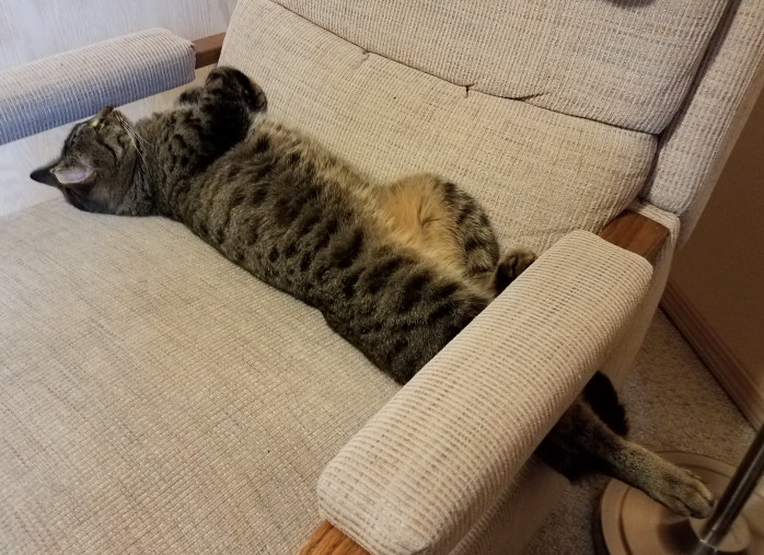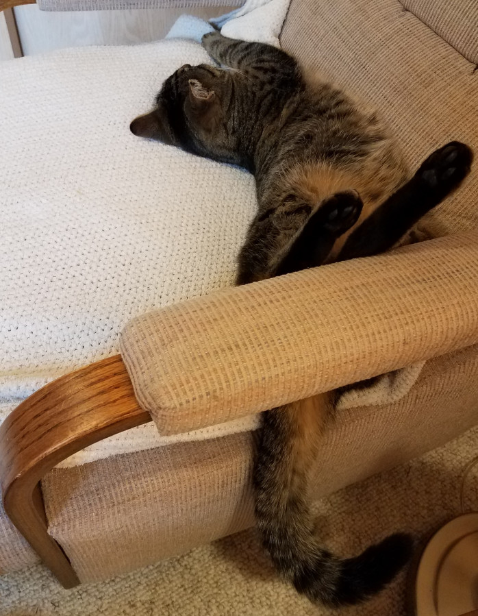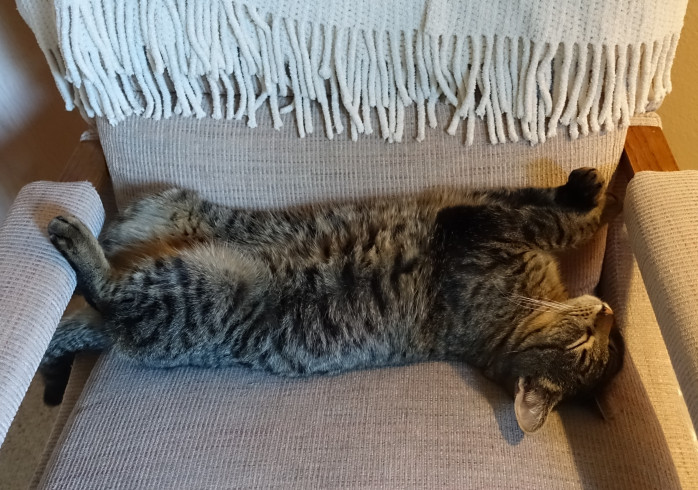 Aww! He loves his chair. I was thinking that maybe if he still has his old chair he won’t think to scratch on the new one🤔 I love when cats sleep on their backs all stretched out like that!
