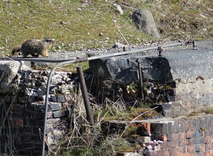 Spokane, like Seattle suffered a major fire in 1889. The foundations of the old water pumping plant can be seen along the river. A plump marmot called it home.