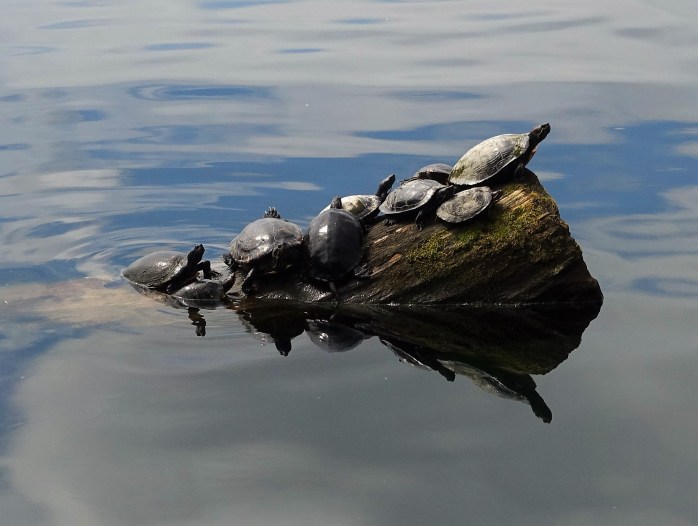 Thanks Pete. Yes, I love to see the turtles. They congregate on the log when the weather’s good, but that’s the most I’ve seen at one time! 9 on the log, and not enough room for others swimming nearby!