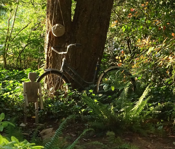 I stopped to admire the garden art, lit from behind by the rising sun, and appreciated once again my husband’s creativity.