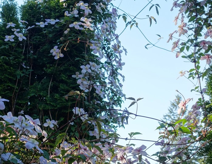 I found the clematis climbing the evergreen shrubs nearby, its pale pink blossoms made lovelier by the contrast.Β Smart plant that clematis.