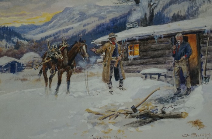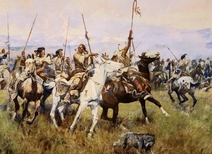 Charles Russell, Western artist and storyteller, was born in St. Louis in 1864 and moved to Montana at the age of 16 to fulfill his dream of becoming a cowboy. He produced over 4000 paintings, drawings and sculptures, of cowboys, the Plains Indians whom he greatly admired, and wildlife, which he called ‘nature’s people.’ We stopped by the CM Russell Museum in Great Falls dedicated to his life and work and I picked up some postcards of his paintings.