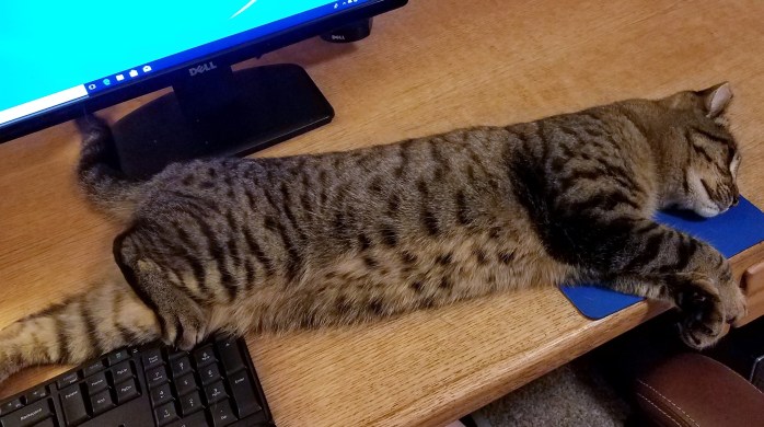 I have all the tech and ergonomics in place. My husband mans my help desk, which works well unless he is out of town. But my new kitty loves to lay on the keyboard or in front of the monitor. In her defense, she is really cute and purrs to disarm me.