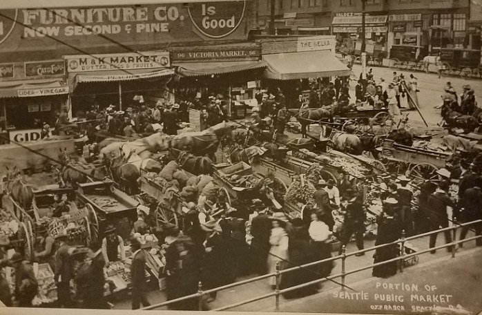 Then today came along and was everything you want a Fall day to be – all sunny and glorious. The timing was right too as I’d planned to meet an old friend for lunch in downtown Seattle. I purposely arrived early enough to accrue lots of steps on my fitbit and visit some of my favorite places at the same time. My first destination was the Pike Place Market, which is to me, the soul of Seattle. My great-grandfather O.T. Frasch might have thought so too when he took this picture in 1909.