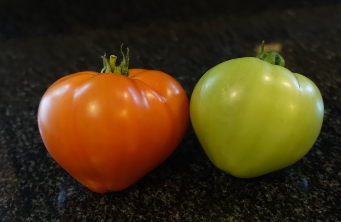 ‘Mixed-race’ tomatoes! Mr Red, Mrs Green, toddler yellow, and baby orange. A great example of the modern family. 🙂
