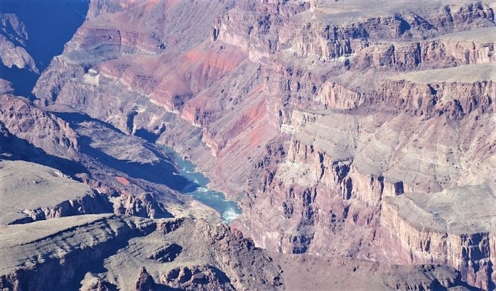 At this point the Colorado is flowing through Granite Gorge, and is at ‘rock bottom,’ Vishnu Basement Rocks formed 1,750 to 1,660 million years ago, the very foundation of the continent.