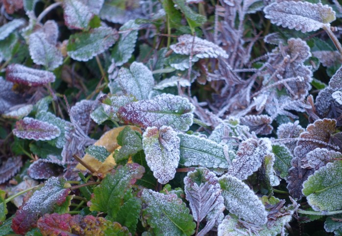 This morning we woke to clear skies, cold temperatures and heavy frost. I had to go to Bellevue for an appointment and stopped by Bellevue Botanical Garden on the way home to get my steps in for the day (the Fitbit seems to be working.) Even by late morning, frost was still evident on the fallen leaves where the sun was just breaking through.