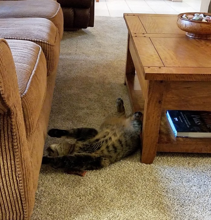 When he couldn’t get it out I came to the rescue though it wasn’t easy being a big couch and all. So I moved Fishy into the kitchen where it slid around the floor nicely.