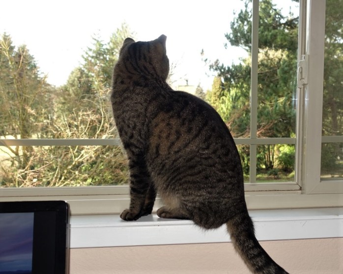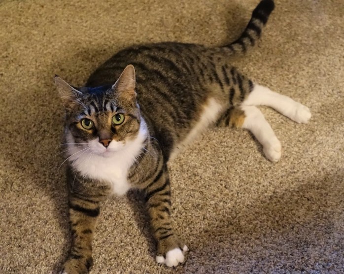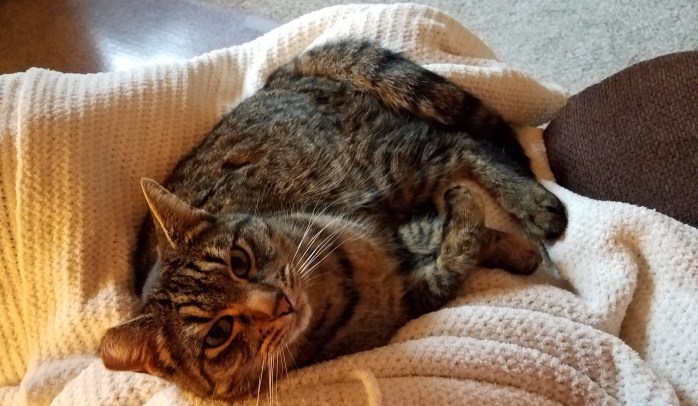 Tiger follows and pulls up alongside the chair asking for his share of the love.Β I oblige with pets and scratches.