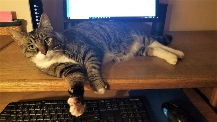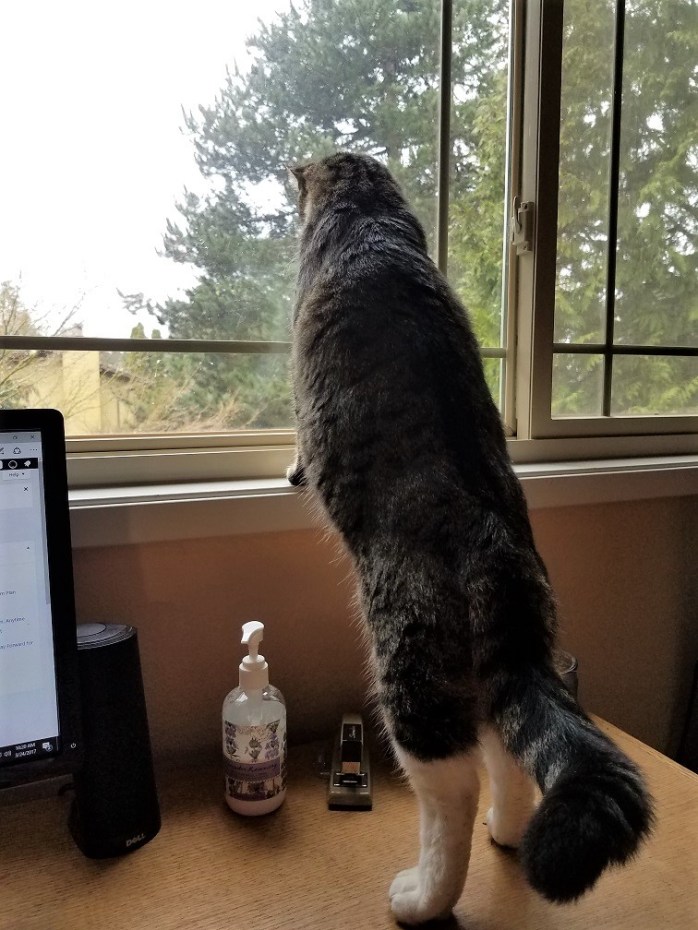 I’m in my office drinking my morning coffee when I hear a meow at the door.