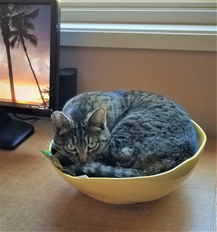 It’s a bowl I usually have in my kitchen that collects odds and ends like mail and receipts. I had moved it into my office temporarily while I was cleaning when Benji decided it would be a good place to take a bath and a nap. It must have been kinda lumpy and uncomfortable, but you’d never know it by him! ππ±