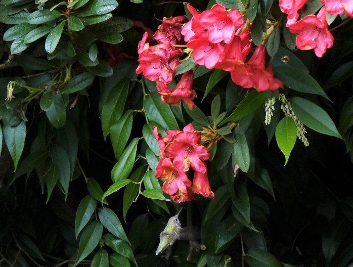I paused nearby to watch a hungry visitor feed from the blossoms of a large rhododendron.