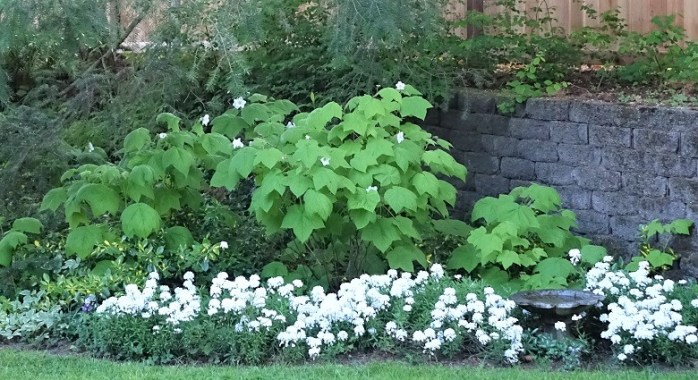 On the other side a thimbleberry anchors the corner. My sister gave me this native and it’s spreading nicely just where I need it to. Soon enough red berries will appear for me and the birds. The candytuft in front makes a nice contrast. You never know for sure what will work, but this did and I am pleased.