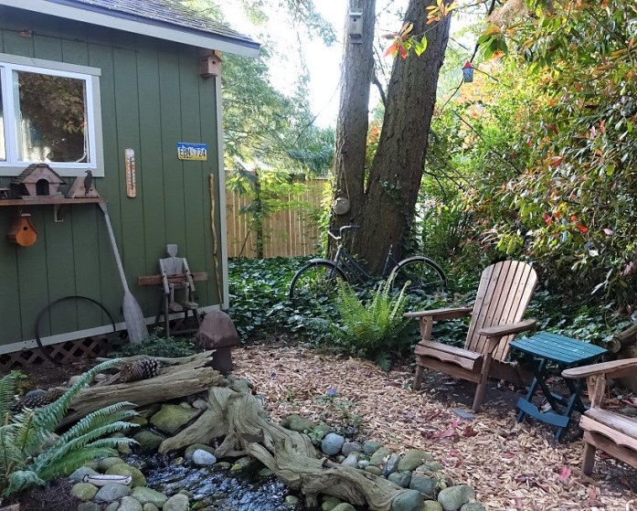 The old bike nearby is being swallowed up in green, more of Bob’s artistic touch.