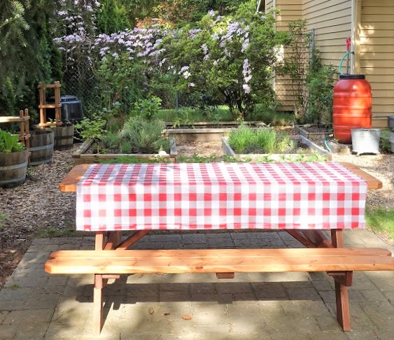 Next to the strawberry bed is the picnic table that Bob built last month – solid and made of Doug Fir – we’ll be eating here soon!