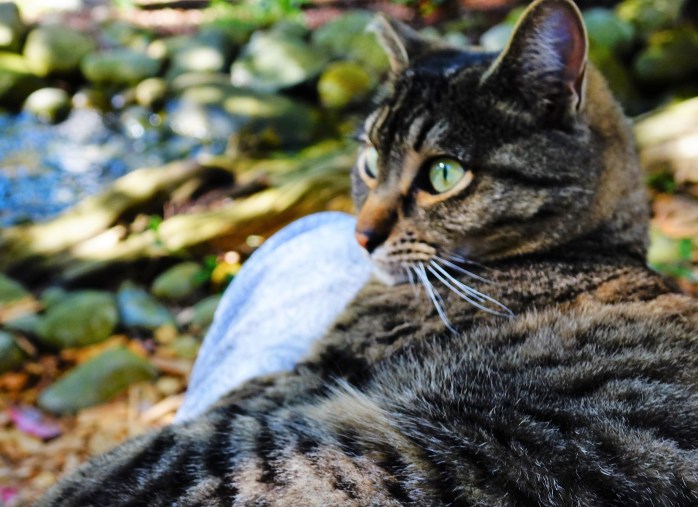 I went outside to sit by the stream and before you know it Benji appeared and took his place.Β Of course I had my camera nearby (I don’t leave home without it) and got a few pictures of the sweet one on my lap.