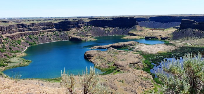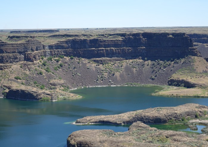 ‘In the heart of the Grand Coulee lies one of the natural wonders of North America—the Dry Falls cataract. This 3.5-mile-wide chasm of basalt, with a drop of 400 feet, was left high and dry thousands of years ago as the last of several Ice Age floods swept through the Grand Coulee.” Washington State Parks.