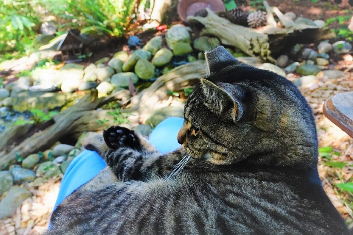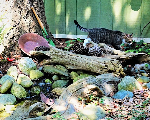 I needed a break from pulling weeds and sat by the stream for a rest.Β It wasn’t long before Tiger and Benji emerged from their secret places to join me.