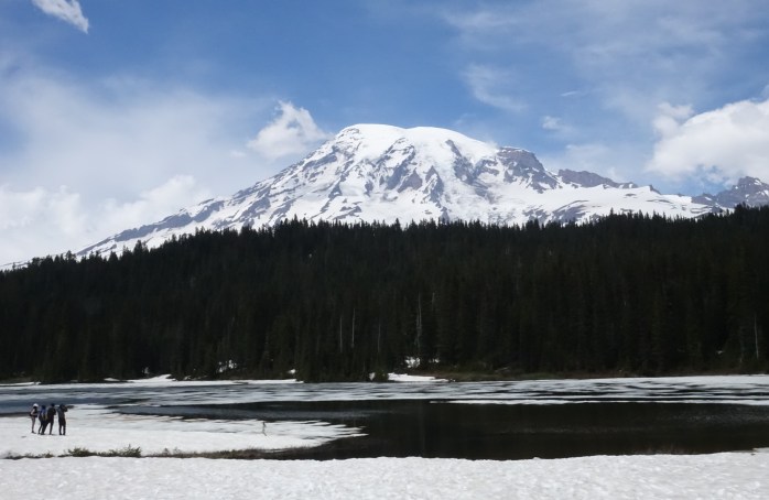 Lets start with Mt. Rainier National Park – just two hours south of Seattle, this one is closest and has everything, including the most beautiful mountain in the country! Some may beg to differ – I can hear protests from as far away as Alaska and California. Still, Rainier gets my vote and here’s one of my favorite pictures of the mountain at Reflection Lakes. Notice the brave ones on thin ice pointing out the view.