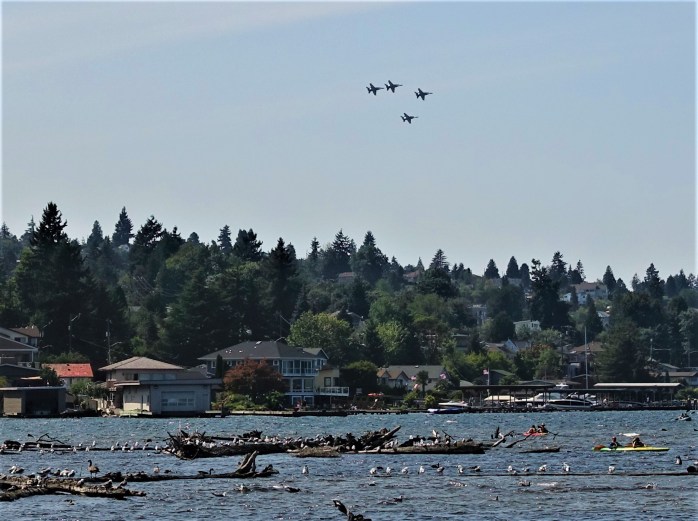 My walk on the Cedar River Trail today yielded more than steps on my Fitbit. For it’s Seafair Weekend and the Blue Angels took to the sky just after I made it to the southern shores of Lake Washington. I wish I could say it was perfect planning on my part – but no – I stumbled upon the occasion and enjoyed it along with the rest.