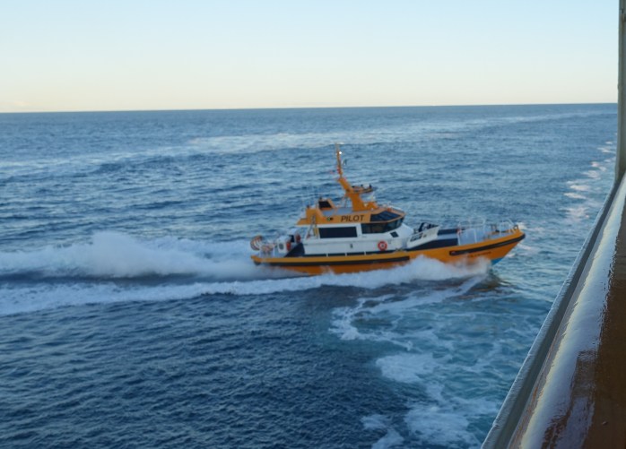 Scared? No not me. I was trusting our experienced Captain and even more, the pilot boat that came to guide our ship safely to port.