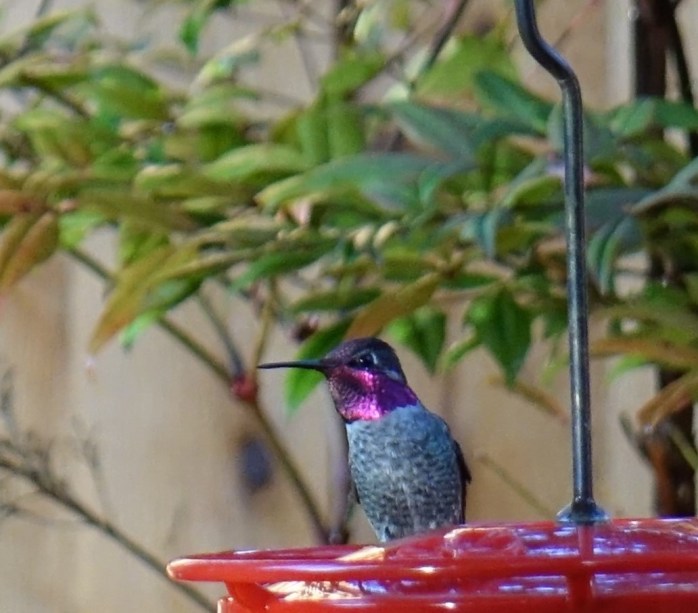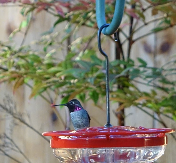 They’re Anna’s Hummingbirds and their dress is somewhat plain – until with a turn of the head, a flash of brilliant color appears.