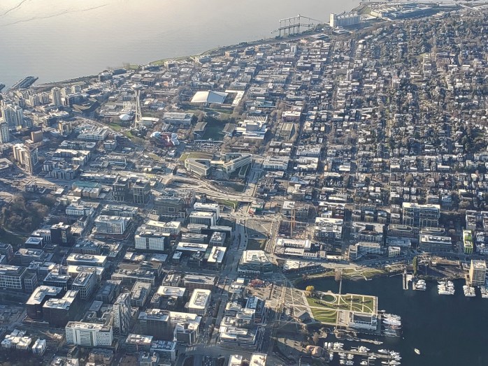 Afterwards we soared over the City’s business district and I waved to my old coworkers in the Seattle Municipal Tower, the building with the green slanted top, bottom center.
