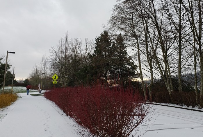 The streets were clear so we bundled up and headed out for a walk on the Cedar River Trail. This was the view from the car as we pulled out of the driveway.