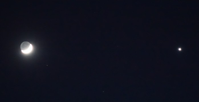 I hadn’t photographed the moon yet this year – how could I with all that rain? – so when I saw it glowing last night in its crescent form with Venus nearby I thought I’d give it a whirl.