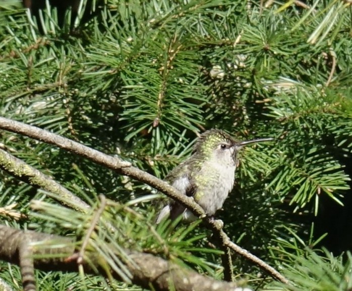 I caught this little hummer perched high above in the fir tree, looking fresh and fluffy.
