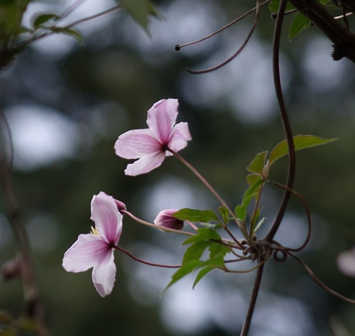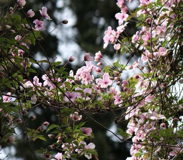 Quite stunning to see the clematis over the trees like that. Nice garden design. I usually see it bloomed in summer not spring. Is it long blooming for you? I have a climbing rose growing up thru our heavenly bamboo. 🙂Anne