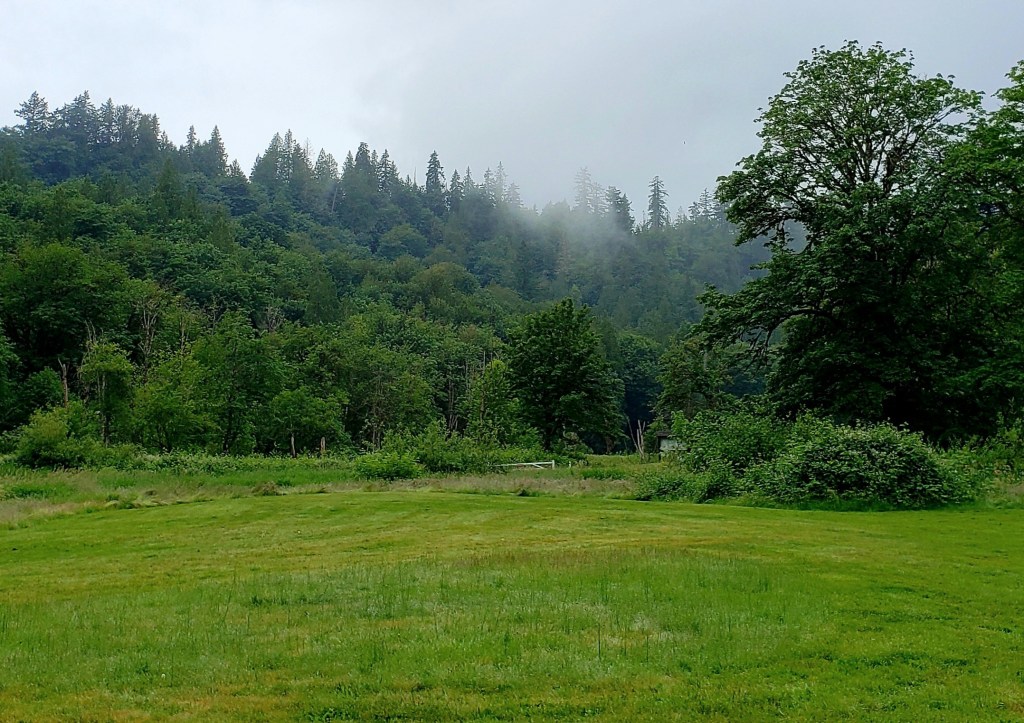 Rain is falling and clouds are hanging low. Grass is wet, my feet are too.