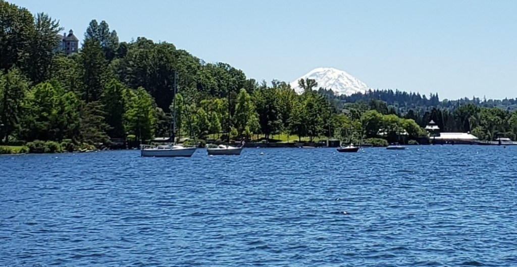 I walked my normal route on the path next to the lake where children swam, eagles flew overhead, turtles rested in their favorite spots and the Mountain was out.