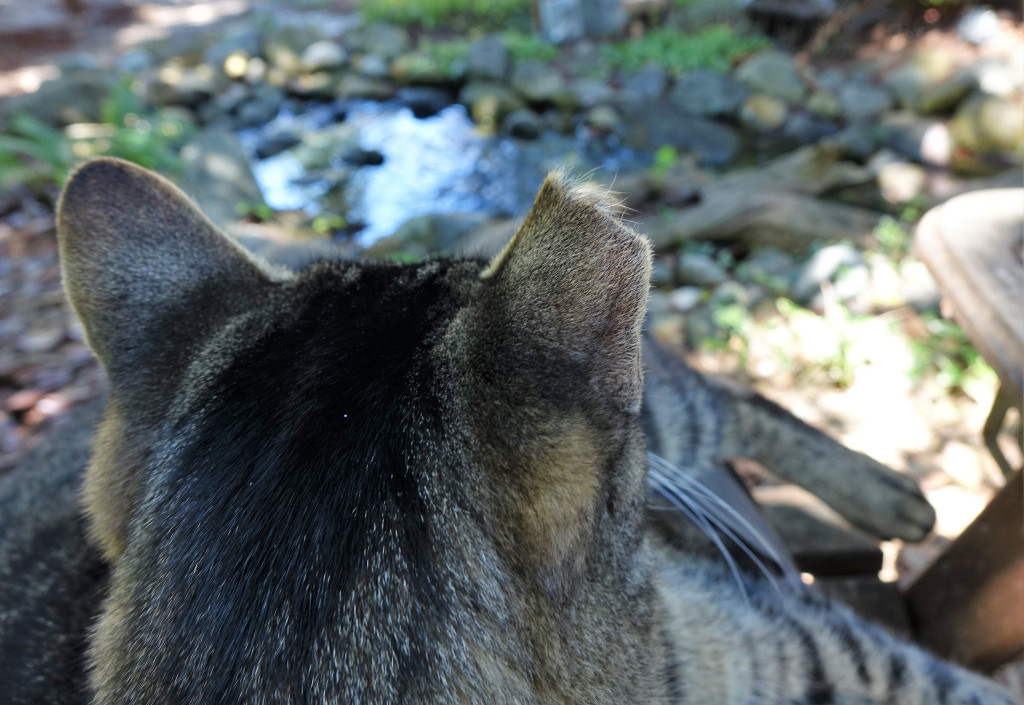 Then Benji appeared. Sweet boy. He missed me while we were gone and I owed him some attention. Somehow I could pet the cat, fill my paper with beautiful prose, and relax by the stream too.